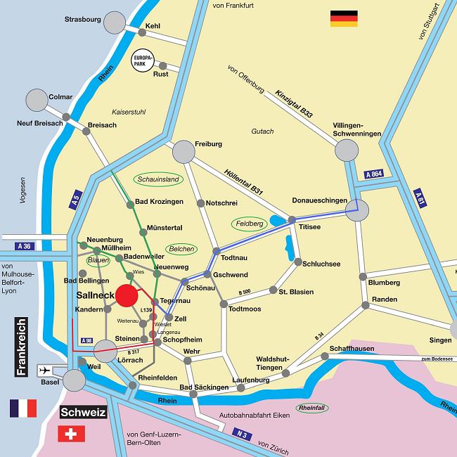 ...Diese Strecke (blau) führt über die A81 (Stuttgart-Singen) bis Donaueschingen und von dort über die B31 und B317 über Titisee - Todtnau - Zell (im Wiesental). Dort rechts über Tegernau nach Sallneck. Dabei überqueren Sie den Feldberg (1495m) was im Winter auch nicht immer einfach zu fahren ist.